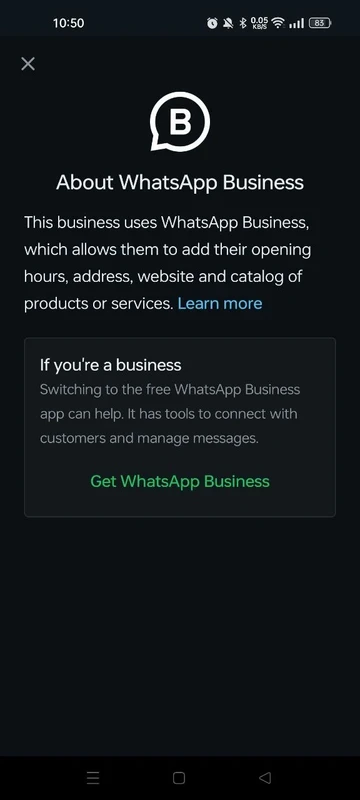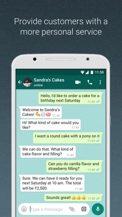 WhatsApp Business, birden fazla özellik sunarken işletmenizi daha doğru bir şekilde yönetmeniz için en iyi çözümdür. İşletmenizi yerelden uluslararası düzeye taşımak için yenilikçi araçlar, müşteri hizmetleri ve satış yeteneklerinin en iyi birleşimini sunar. Müşterilerinizle güçlü ve güvenilir bir ilişki kurmak için iş etkileşiminizi kolaylaştırın. Kullanıcı dostu arayüz, müşterilerin ihtiyaçlarını düzenli bir şekilde karşılamanıza ve sohbetten ayrılmadan uygulama içi satın alma seçeneklerine erişmenize olanak tanır.